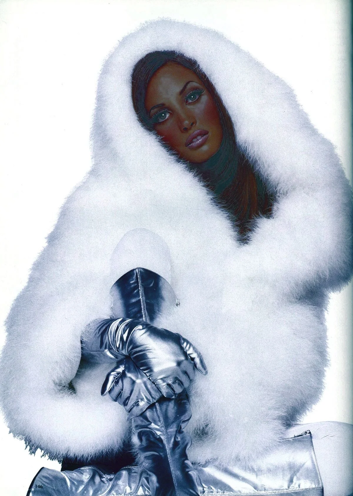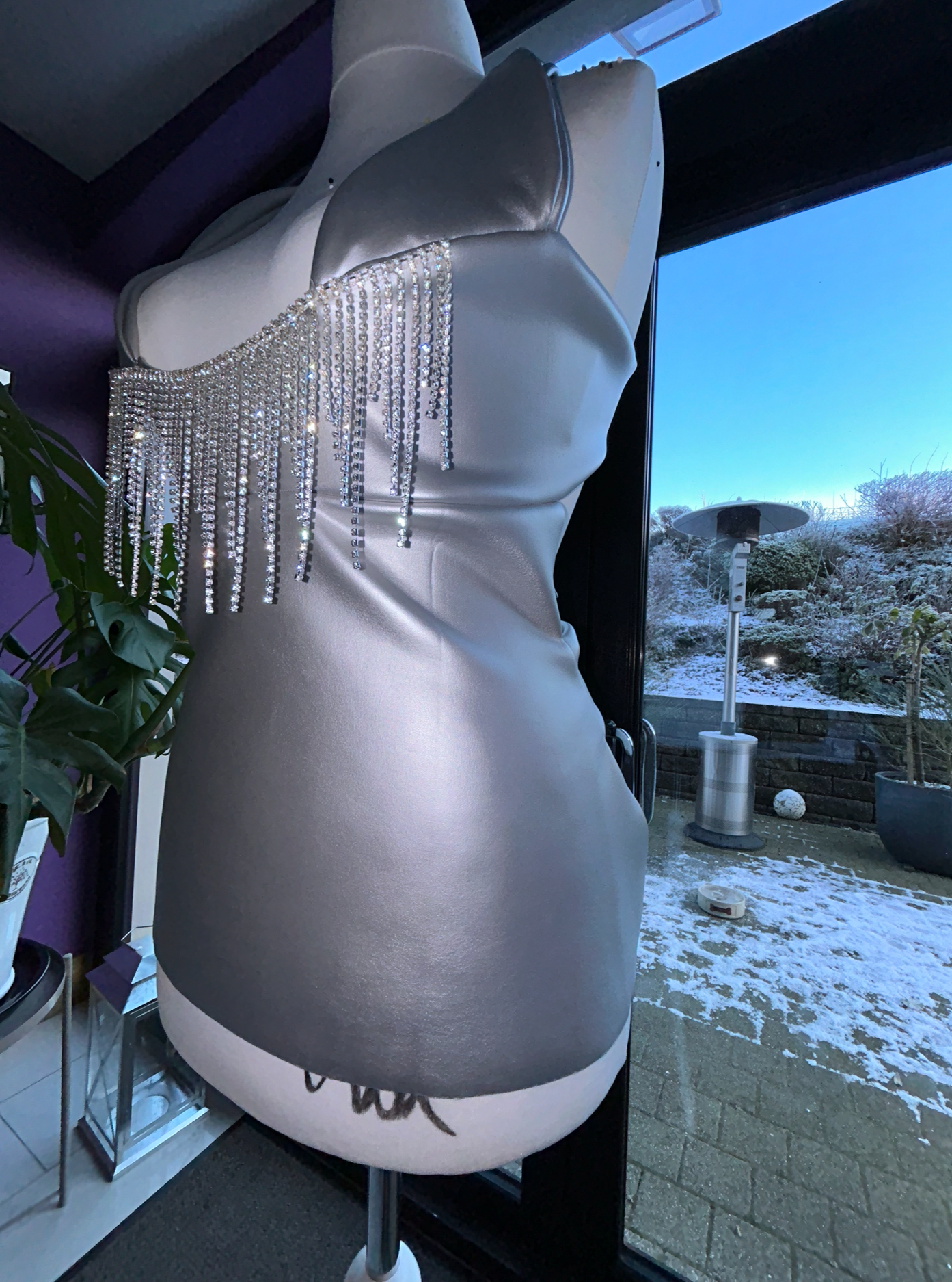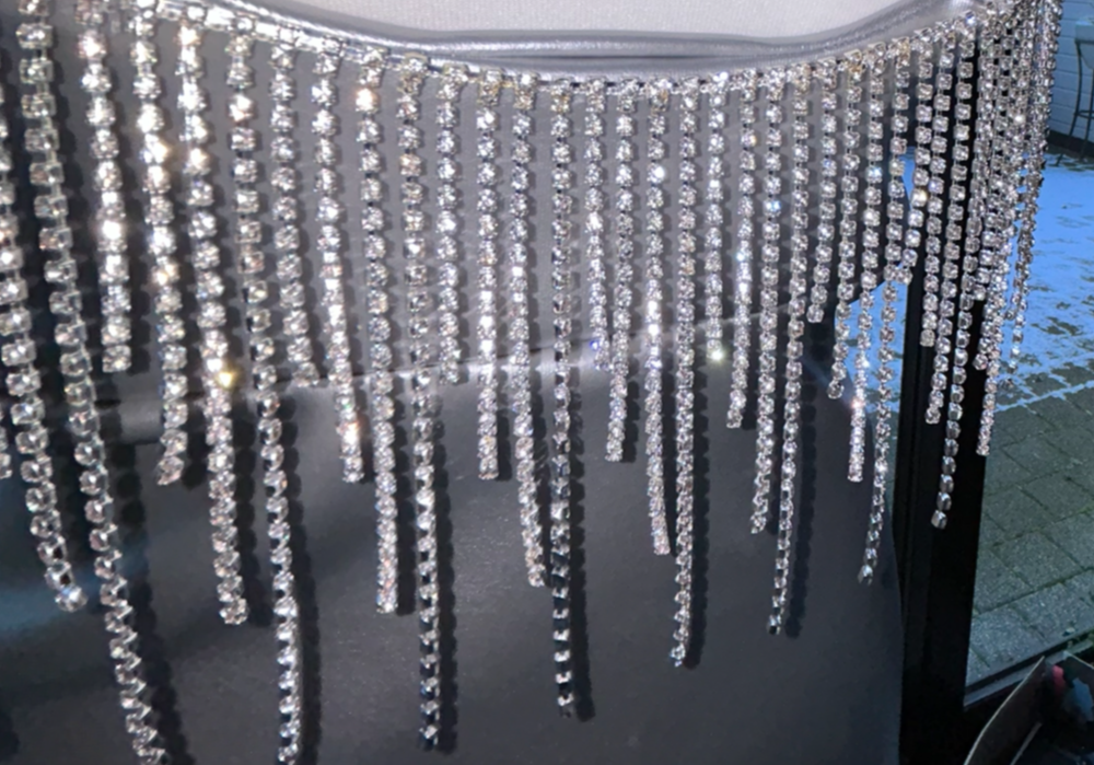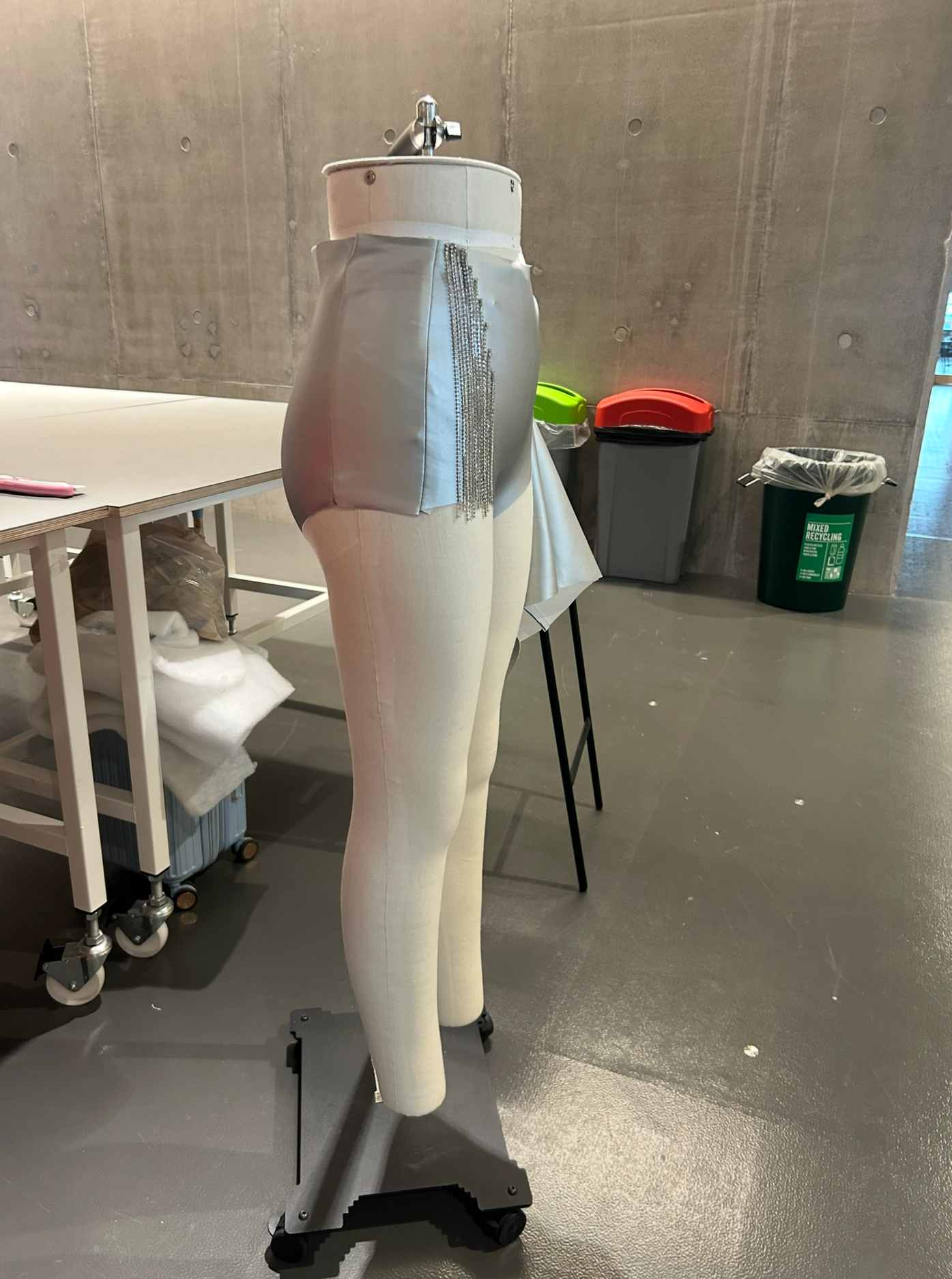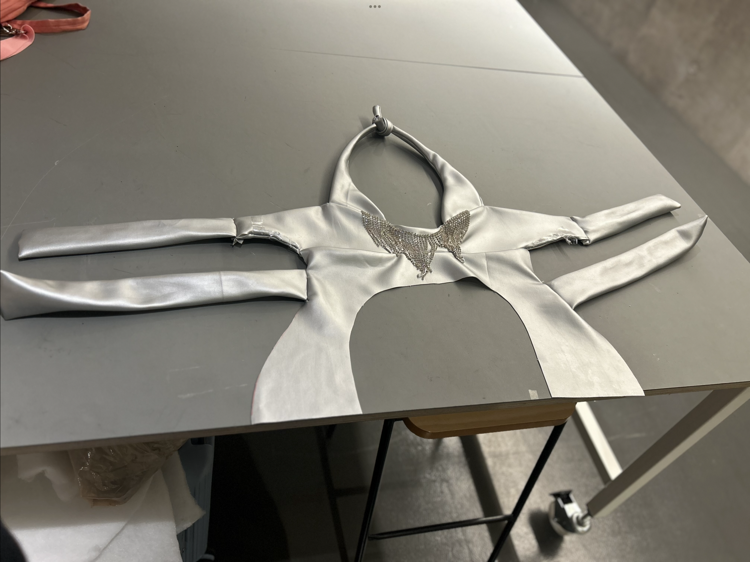 Diamanté rhinestoning was hand sewn across the breast section to create an icicle-like effect, as if she had just emerged from the snow. The clustered stones catch the light the way frozen droplets would, giving the illusion of shimmering icicles cascading from the top. This detailing enhances the garment’s frosted, winter-born aesthetic, making the entire look feel both ethereal and strikingly cold.