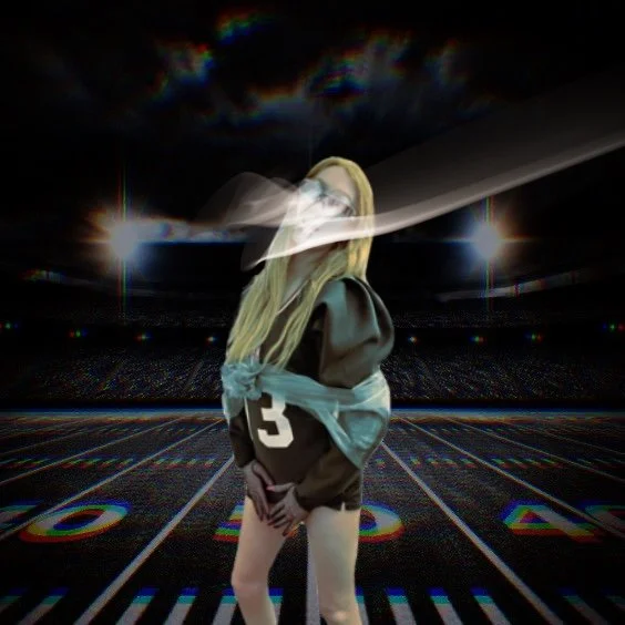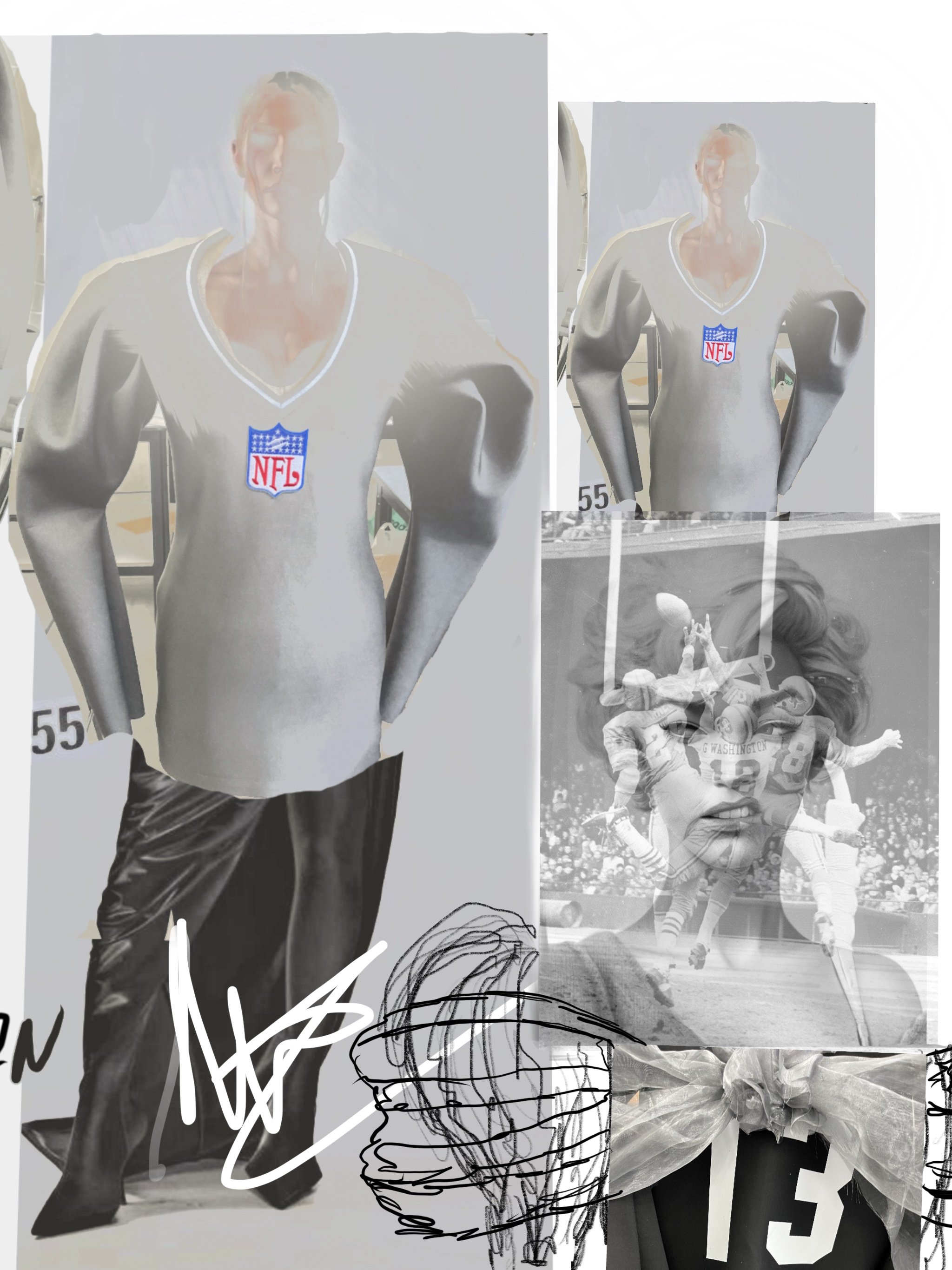 This look imagines the NFL jersey in its most primitive form, before numbers, names, and graphic details were introduced. By stripping the garment back, the sleeves become the central runway statement, standing alone as the core aesthetic of the piece. The intention was to let the beauty and power of the sleeves speak for themselves, drawing inspiration from the under-armour layers worn by NFL players during a match, the exaggerated arms, the bulk, the physical presence. The result transforms the familiar into high-end runway, elevating the kind of oversized jersey silhouettes a teenage boy might wear to a house party into a sculptural couture statement.